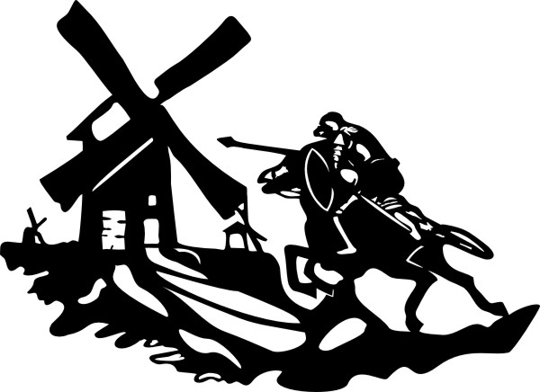 A wonderful representation of Don Quixote of La Mancha tilting at the windmill. This piece is cut from 16 GA steel and finished in a black enamel and clearcoat .