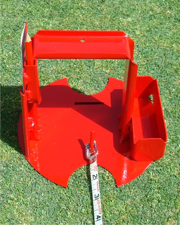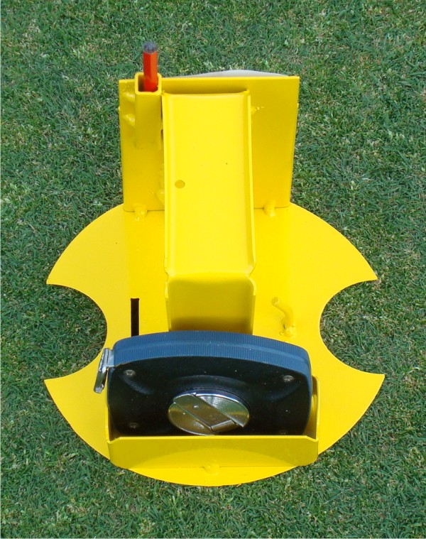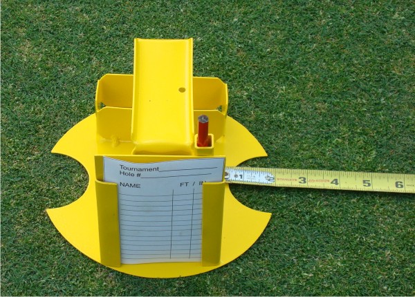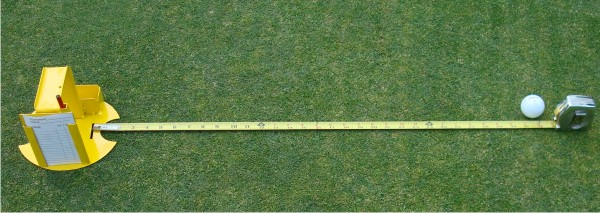 This is the closest to the pin measuring tool you've been looking for. No more fumbling around needing two people to measure, or looking for the pencil and paper to write the measurement down. The best part is that EVERYONE measures exactly the same way, NO MORE GUESS-TIMATES. Just put the tool into the hole, attach the tape measure to either the pin or the slot, and measure to the ball. The paper , pencil , and tape measure are stored right in the tool so there's no need to look around for them. Write down your measurements and you're done.